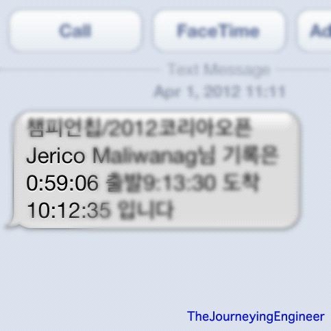 I wondered yesterday if I can be able to fully run a 10 km distance. And as it turned out, I can! I was satisfied with my first experience running in the LIG Korea Open Marathon, more so, the very first event I joined. Below is a text message from the organizer indicating my run’s time – less than an hour, yeah!