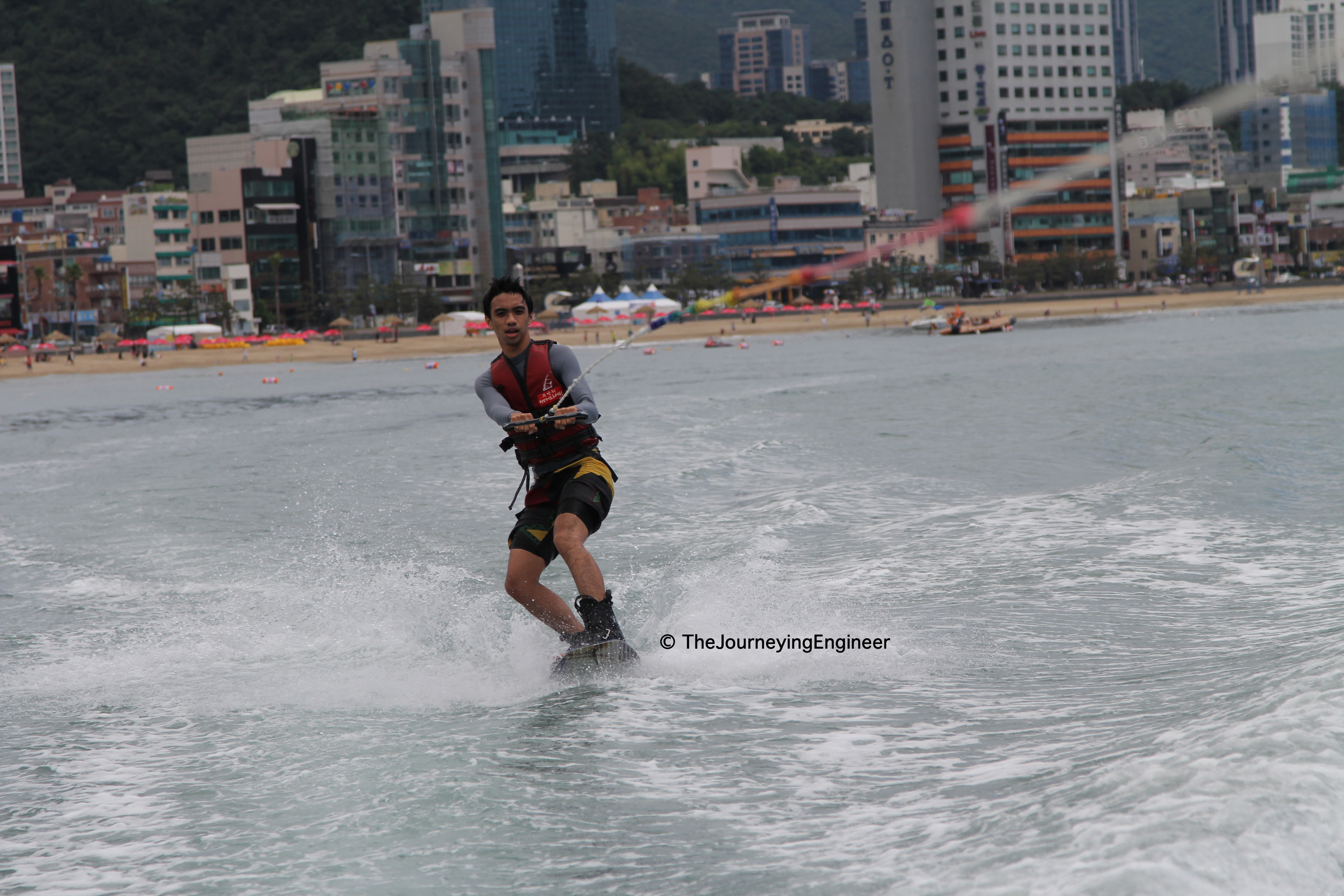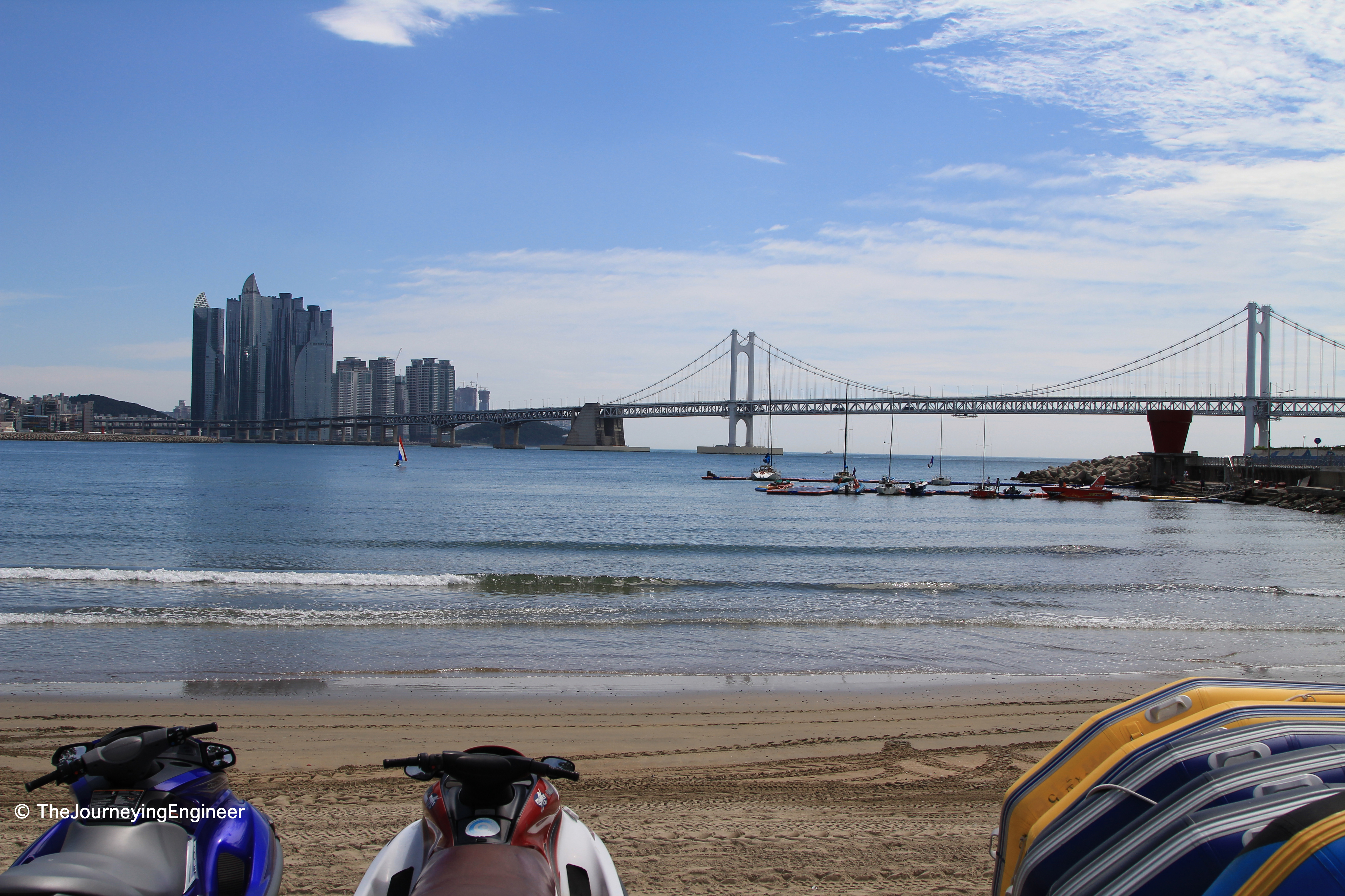 Tiemen saw that we can wakeboard in Gwangalli beach. So, after checking out and having breakfast, we hired a taxi going to Gwangalli. How nice of the taxi driver to pass through the scenic Gwangan bridge! Tip: passing by the bridge meant the taxi driver took a long detour. He tricked us, and we noticed it early on. Tiemen ordered him to drop us off as soon as the taxi neared the beach, but it was not after we have crossed the bridge. That’s one thing a tourist should be aware of in Busan – some taxi drivers may cheat you. We didn’t feel bad, as we had the chance to see the bridge up close. But be attentive.