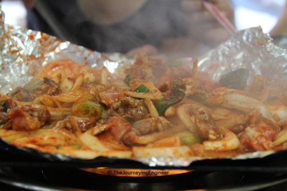 While we were in Gwangalli the night before, we saw lots of king crabs in aquariums outside several restaurants. That’s why we thought of trying them in Jagalchi. Alas, the price was twice as much (KRW 70,000 per kilo), and we opted not to try it this time despite our hunger, as it was too expensive! (1 king crab weighed about 2 kilos.) So, we looked for an alternative. The area seems to be famous for serving eels as well, so we decided to try that instead. After looking for bargain prices, we ended up at a small restaurant that just costs us KRW 39,000 all in all. Tip: Grilled eels are more expensive than those cooked in red sauce and vegetables (not sure how to call/describe it, red spicy eel stew?). As customary to seafood pricing, large eels are more expensive than small eels per kilo. With that, you can easily conclude that we ate small eels cooked in red sauce and vegetables. 😉