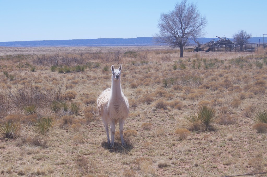 That portion of Route 66 turned out to be a dirt road! Oops. But we drove on. Shortly after, things got interesting. Hey look, a llama! We stopped to take its photo. It seemed threatened so we carefully approached the fence. The llama stayed put, even posing to show its facial marks. It’s like an omen of the interesting things to come. Abandoned, weathered buildings alternate with farmland. And of course, the former attracted us. Irony… that’s what this abandoned site tells, thanks to the vandal.