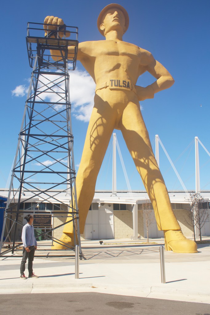 I picked an attraction in Tulsa, but pinned the lunch place at a town before the city, thinking we should go to a less busy area. That area is Sand Springs, which turned out to be a good stop over. First off, the food at Napoli’s is fresh and good. And then, the quaint town invited us to walk and look around. We found an antique shop were my party found a few items to get, and close to it is a good enough coffee shop for our afternoon kick. Then, we stopped by Tulsa for the giant Golden Driller. I relate to this statue as a former member of the Oil and Gas Industry. The message on the plate struck a chord to be honest: