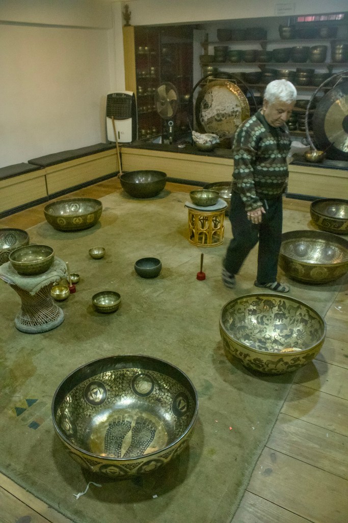 A short baby-faced man in his senior years runs the said shop. He led us to the basement where he conducts the demonstrations. Singing bowls basically are resonating metal bowls typically made of brass or bronze. It produces a resonating sound when tapped or when you slide a mallet or stick at a specific pressure round and round the brim. That makes a singing bowl a good accompaniment to meditation. And boy, was that sound soothing!