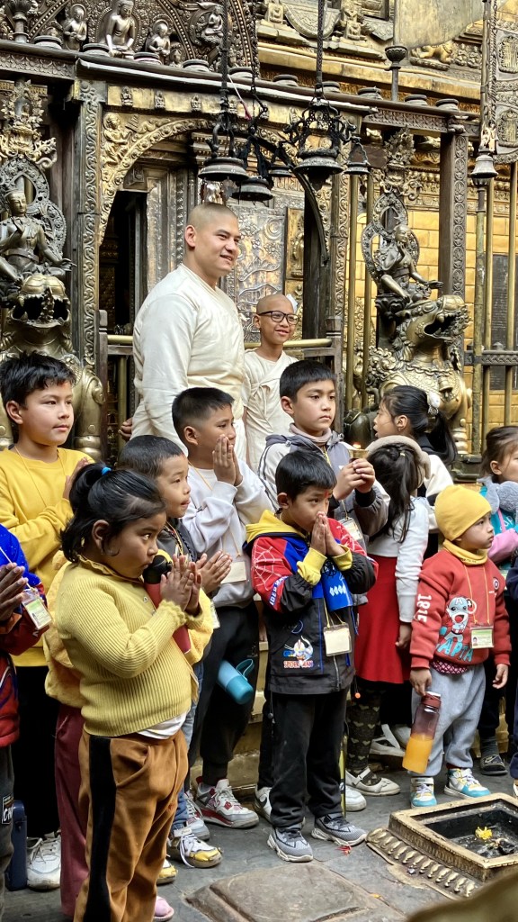 We entered an old monastery before leaving Patan: Hiranyavarna Mahāvihāra/Kwa Baha. It is sometimes called the golden temple, and a few parts of the monastery are indeed gold plated. This is where I saw a large prayer wheel for the first time. While this is a Buddhist temple, there are a few elements of Hinduism in the designs. Before leaving, we saw a group of kids that had the pleasure of meeting the monks assigned as priests of the temple, with whom they had a photo op.